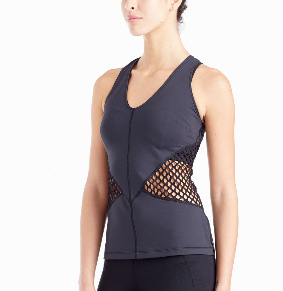Adds a sporty and contemporary edge to your look- V-neck tank top with angular fishnet detailing and racer back detailing (bra pictured is not included). This style feature a single mesh layer that appears more transparent when worn. Silky soft four-way stretch moisture wicking, breathable, high performance fabric from Switzerland. Angular mesh back detailing for style, ventilation and to expose bra details. Comfortable mesh pieced racer back. Long length for comfort and coverage.